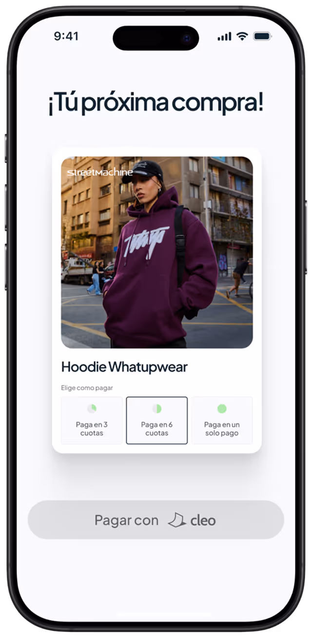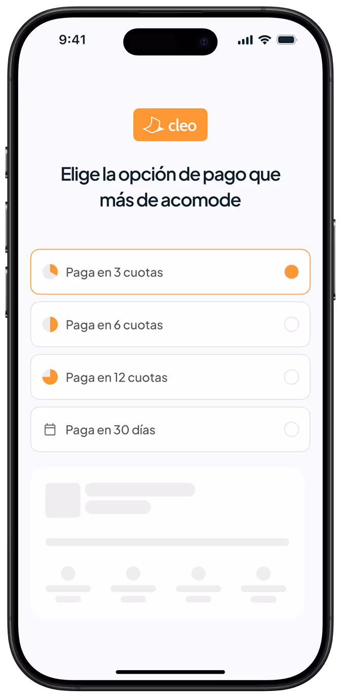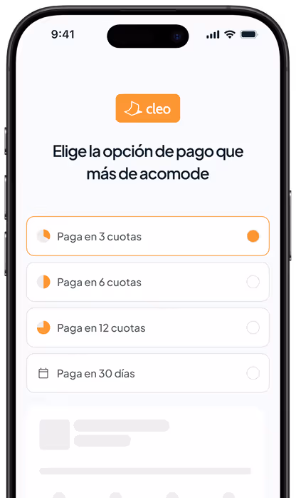 Elige Cleo al pagar en tus tiendas, valida tu identidad con tu banco y Clave Única, y decide cómo pagar: en 14 o 30 días, o en cuotas. Sin tarjeta de crédito.
